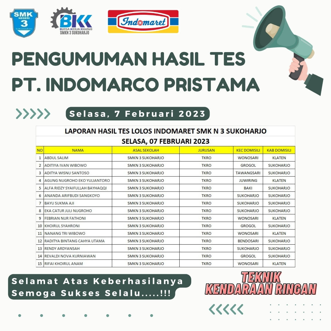 SMK Negeri 3 Sukoharjo telah bekerja sama dengan berbagai industri seperti Indomarco, perusahaan konveksi, Hotel-hotel terkemuka di solo raya, restoran
